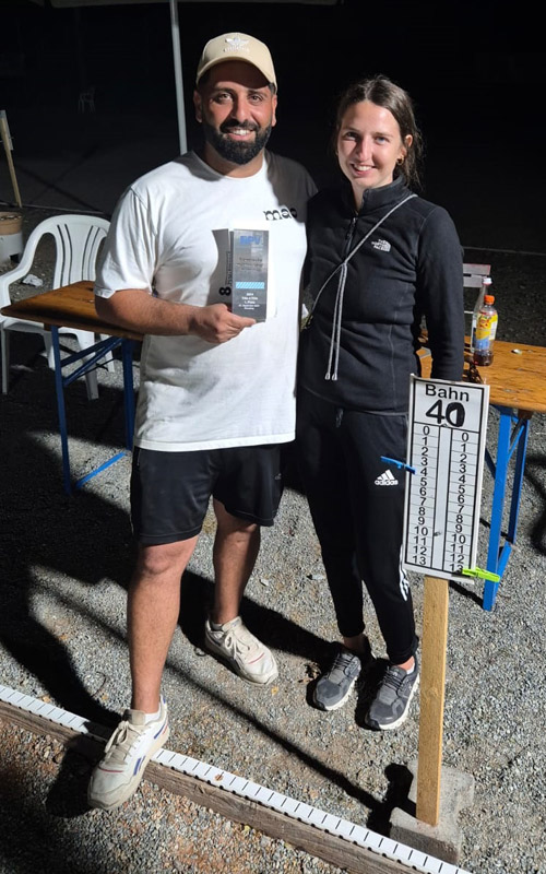 Nach dem Erreichen des siebten Platzes in der Pétanque-Bundesliga mit der Mechenharder Mannschaft krönte Max Borst seine konstante Saisonleistung mit dem Gewinn der bayerischen Meisterschaft in der Disziplin Tête-à-Tête. Damit qualifizierte sich der gebürtige Schweinfurter neben Nicholas Mari aus Mechenhard und dem Niedernberger Klaus Giegerich, die beide den neunten Platz belegten, auch für die Deutsche Meisterschaft in der gleichen Disziplin, die am 21./22. September im saarländischen Ensdorf stattfindet. |